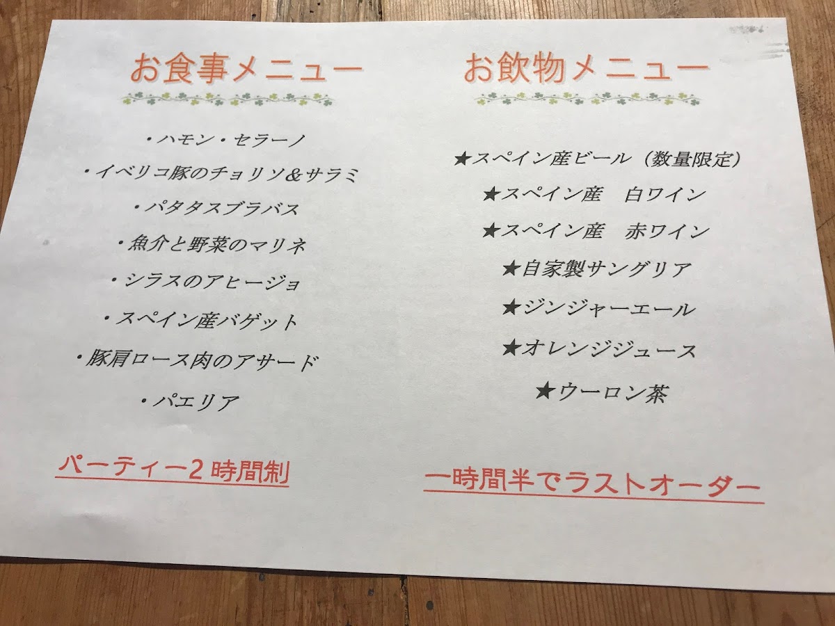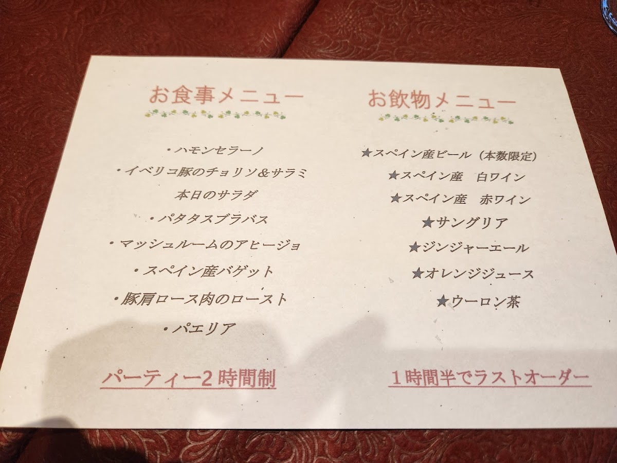 2時間飲み放題付きのパーティプラン。お料理は大皿スタイルでのご提供となります。 【料理内容】 ★スペイン産 生ハム ★スペイン風 オムレツ ★パタタスブラバス ★本日のサラダ ★マッシュルームのアヒージョ ★スペイン産バゲット ★豚肩ロースのロースト ★本日のパエリア 【飲み放題ドリンクメニュー】 スペイン産カヴァ(スパークリングワイン) スペイン産ビール アルハンブラ スペイン産ワイン白、赤ワイン 特製サングリア 烏龍茶 オレンジジュース ジンジャーエール