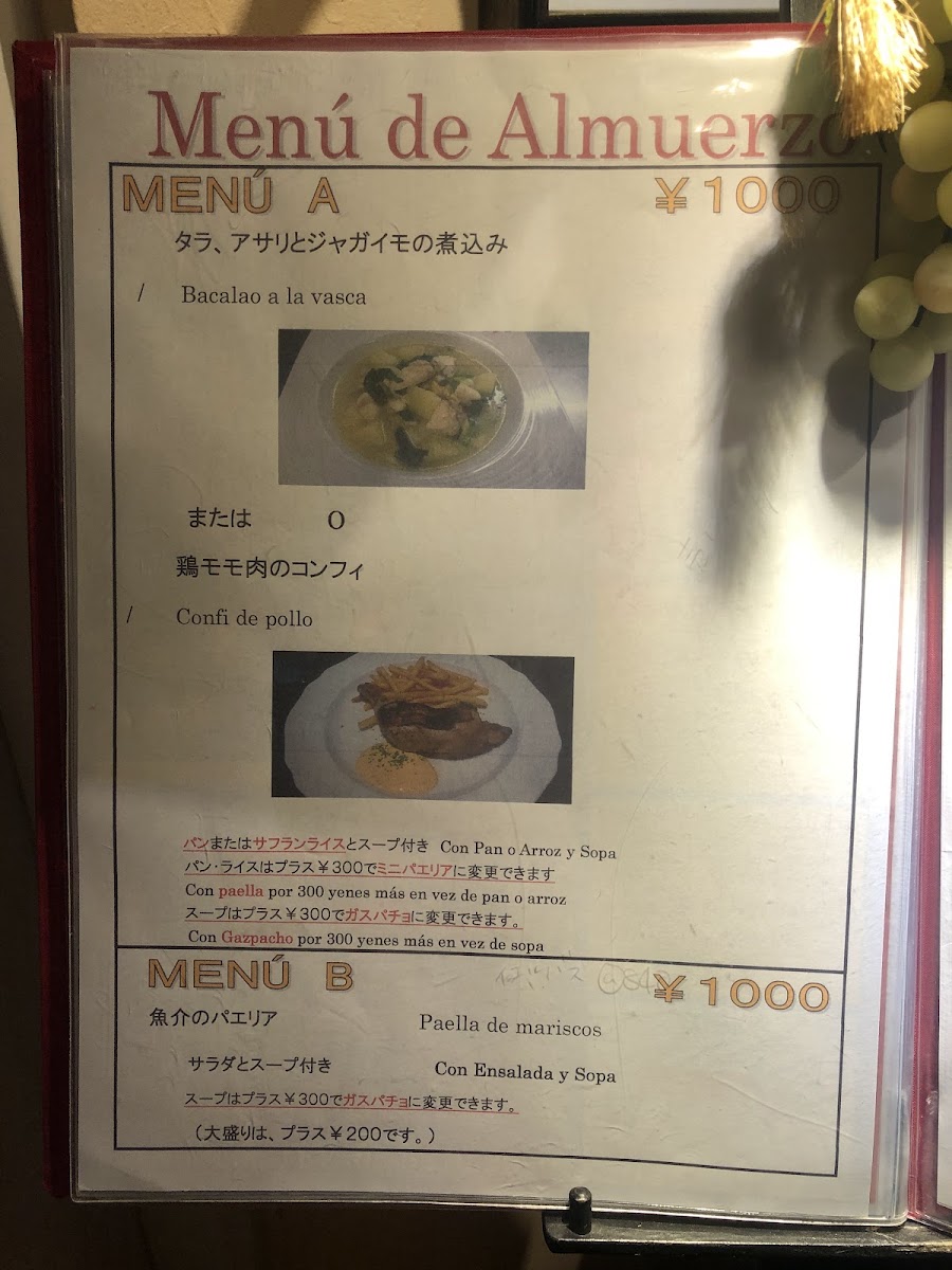 週替りランチ(お肉) 週替りランチ(お魚) ※パンまたはサフランライスとスープ付き。 ※パン・ライスはプラス¥400でミニパエリアに変更できます。 ※スープはプラス¥400でガスパチョに変更できます。
